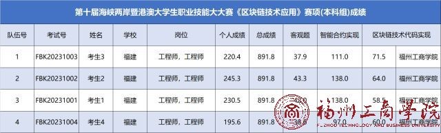 第十届海峡两岸暨港澳大学生职业技能大赛再传佳音,在区块链技术应用技能赛项中,由我校yl7703永利集团区块链工程专业学子张文戈、吕文彬、王良喜、陈锐(指导教师:林菡、卢志兴)组成的参赛队,在激烈竞逐中脱颖而出,斩获团体总分第一名,荣登本科组一等奖。