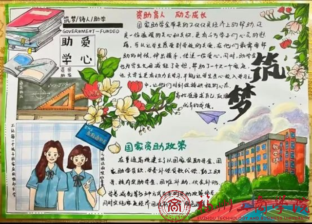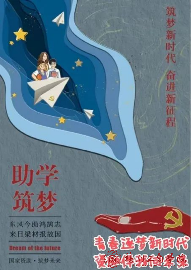 设计说明:宣传画主体为蓝色色调,寓意梦想,右下角有党旗幻化成一只手,寓意中国共产党资助政策给了我们上学筑梦的机会,三个孩子在纸飞机上眺望远方,对未来充满希望,乘着国家资助的飞机逐梦飞翔。感谢国家资助政策,我会在政策帮助下,越飞越高,越飞越远,实现自己的梦想!