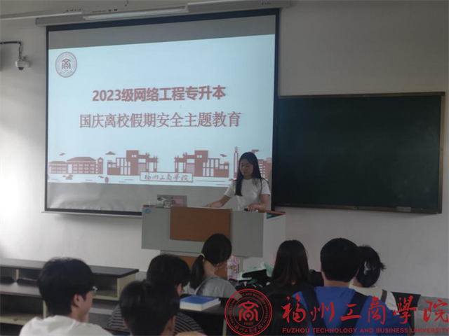 9月27日,yl7703永利集团2023级网络工程(专升本)在教学楼E501开展“国庆离校假期安全主题教育班会”。本次班会由2023级网络工程(专升本)辅导员秦素素主持,全体同学积极参加。