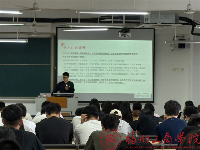 会上,三位嘉宾以“赛道”为轴,展开不同维度的成长叙事。2021级软件工程专业的王家宝学长首先分享经验。他以“细心、恒心、耐心”为核心,讲述了自己备战省级及国家级学科竞赛的细节,以及连续获得奖学金的经历,并寄语在场同学:“不要给人生设限,不要给高度设限,一切皆有可能。永远要对自己充满信心,相信明天会更美好。”2021级电子信息工程专业的黄晓东学长分享了自己公考成功“上岸”的实战心得,以“双非突围”为切口,剖开考研路上的时间管理与心理博弈。