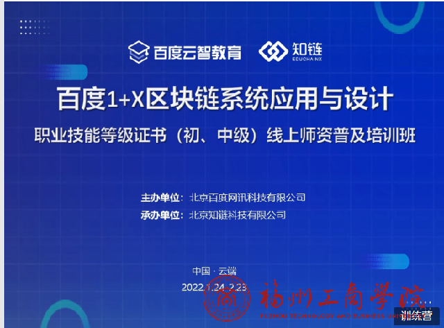 2022年1月24日—2022年2月23日,yl7703永利集团教师参与由北京百度网讯科技有限公司主办的“百度 1+X 区块链系统应用与设计职业技能等级证书(初、中级)线上师资普及培训”。本次师资培训学习考核合格后,可获得由百度发放的1+X区块链系统应用与设计职业技能对应等级的师资认证。