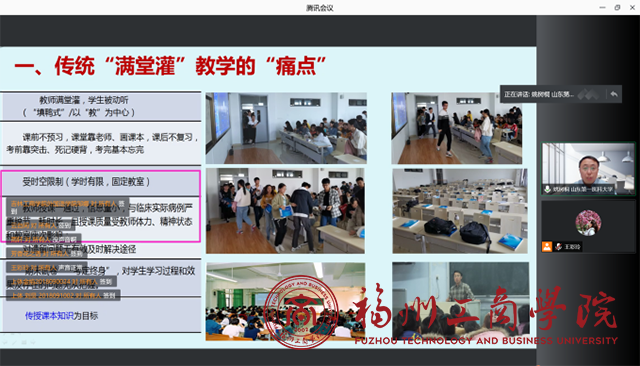 2022年3月27日19:30,梁娟老师在线学习山东第一医科大学姚树桐教授分享的“众志成城为战疫,隔空教学不打折”课程,课上姚老师就《病理生理学》这门课程是如何建设线上线下混合式一流课程作出了详细的说明。姚老师从传统“满堂灌”教学的痛点、线上教学的痛点、改革方案的实施、考核评价体系、教学成效等几个方面进行经验分享,并且给出了具体实施方案。