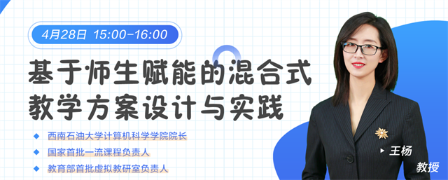 2022年4月28日西南石油大学计算机科学学院院长、首届教师教学创新大赛一等奖获得者王杨教授,分享了基于师生赋能的混合式教学方案设计与实践。本报告从当前大学课堂教学面临的共性问题出发,分析新时代教学三中心发生的变化,介绍如何再造线上优质课程资源以更好地服务于课堂教学,如何设计满足学生个性化需求的混合式教学模式以提高学生课堂的深度参与,如何在教学全过程为师生赋能以提高师生的教与学胜任力,最终实现以学为本的教学价值取向。