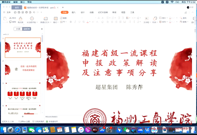 超星高级课程顾问陈秀萍老师作了《省级一流课程申报政策解读及申报注意事项分享》专题培训,从一流本科课程申报相关文件解读、课程申报要点、申报说课及课堂实录拍摄准备及注意事项等方面进行系统讲解,指出了申报材料中存在的共性问题,并对我校教师在课程建设和申报过程中的问题进行答疑。