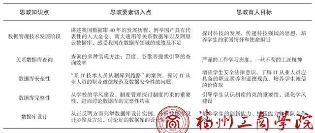 例如,在课程讲授数据库的发展历程时,首先以弹幕方式让大家讨论现在熟知的数据库产品,然后通过对比当前流行的数据库产品,如国外的Oracle、mysql、SQL Server等和我国的人大金仓、南大通用、武汉达梦等国产优秀数据库,以及在当前大数据时代背景下大家熟知的阿里云数据库,让学生了解我国数据库的发展历程,认识我国数据库产品的优缺点和应用情况,清楚我国在自主系统软件领域中所处的位置,明确每位计算机专业的工程师肩上的责任,培养学生的民族自豪感及自信心,同时树立科技强国的思想,激发学生的爱国主义热情。通过介绍关系数据模型的发展历程让学生了解专业知识产生的过程,帮助学生建立在面对科学研究中的困难时应具备的正确态度。在讲授数据库安全性时,首先引入社会问题,如"某公司数据部门IT技术人员从删库到跑路"的案例,从而吸引学生注意力,在轻松愉悦的气氛中讨论数据安全事件,逐步进入主题——学习数据库安全的问题及数据库权限管理的知识,并引导学生学习IT从业人员应当具备的职业道德规范,同时在工作学习中都应养成严谨的态度,树立正确的职业道德和职业操守,有效实现知识的迁移。