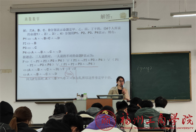 《离散数学》是现代数学的一个重要分支,以研究离散量的结构和相互间的关系为主要目标,着重培养学生抽象思维和严密的逻辑推理能力。授课过程中施达雅通过课堂回顾的形式总结了量词的引入与消去规则,然后引出本堂课的教学重点——一阶逻辑的推理理论。她通过多个实际的一阶逻辑推理例子,由浅入深、循序渐进地分析一阶逻辑推理的构造与证明方式,并通过实际例子与抽象符号相结合的推理方式展示了一阶逻辑推理过程中容易产生的“似是而非”的错误推理方法,引导学生构建科学的逻辑思维方式。