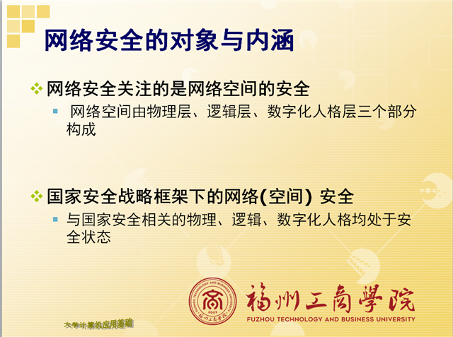 例如《大学计算机应用基础》中的《计算机网络安全》内容主要讲的就是互联网安全相关技术。根据内容可以很自然的加入个人互联网使用时安全防范以及互联网使用的道德规范的思政元素。在网上学习了沈逸老师的《互联网空间治理》相关内容后,在这一章加入了国家层面的思政内容,通过和学生探讨互联网空间是否有国界,从而引出互联网主权问题和互联网层面的国家安全。