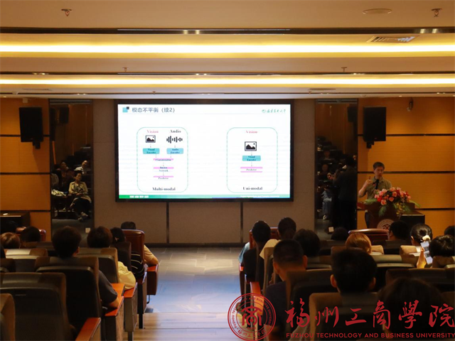 讲座现场,王长缨教授围绕“多模态的思想出发点 -- 意义和逻辑起点”、“当前多模态主要研究热点”、“几个模态不平衡的应对策略”等内容进行阐述,王长缨教授运用大量生活实例阐述多模态的运行方式和学习方式,并结合图表等形式展示关注梯度方向的模态不平衡描述与算法,阐明如何运用模态算法完善和改进早期传统策略,形成新型算法策略。讲座最后,部分师生从讲座内容中生发思考,与王教授进行交流探讨,与会师生获益匪浅。