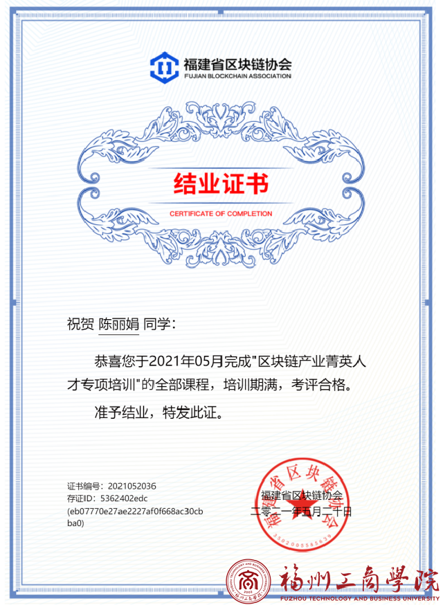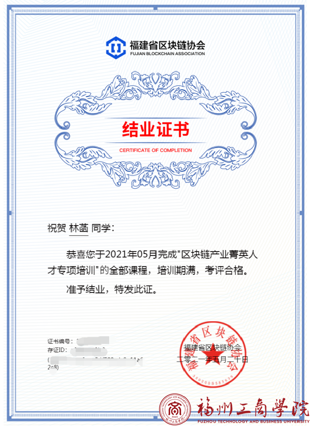 近日,两名教师在完成培训课程后,福州高新技术产业开发区管理委员会与福州地区大学新校区管理委员会统一开展福州市区块链产业“菁英”人才评价认证,并根据能力评价认定结果,我院两位教师符合条件,通过认证,获得了区块链产业菁英人才认证证书。