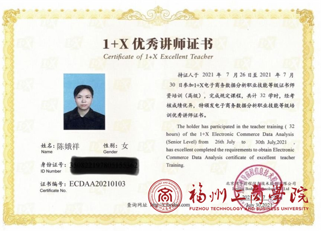 本次培训由北京博导前程信息技术股份有限公司主办,全国有100多位老师参加,依托i博导智慧教育线上平台完成培训和考核,陈娥祥老师所在的小组在实操演练过程中获得了优秀小组荣誉,同时在培训最后一天进行了理论考试和实操考试,陈娥祥老师以优秀成绩通过考核,获得1+X电子商务数据分析高级技能等级证书的优秀讲师教师资格。