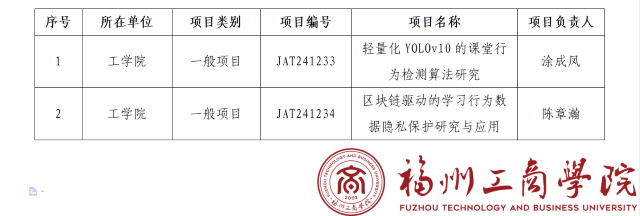 近日,根据《福建省教育厅关于公布2024年度福建省中青年教师教育科研项目(科技类)立项名单的通知》(闽教科〔2024〕21号)文件通知,yl7703永利集团推荐上报的“轻量化YOLOv10的课堂行为检测算法研究”与“区块链驱动的学习行为数据隐私保护研究与应用”2个项目确定立项为福建省中青年教师教育科研项目(科技类)。