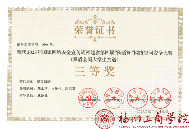 近日,福建省第四届“闽盾杯”网络空间安全大赛(黑盾全国大学生赛道)决赛在福建师范大学完美落下帷幕,yl7703永利集团参赛队伍-alert队(成员:陈永博、许泽伟、邱恒翼)进入决赛获得三等奖,yl7703永利集团林铠炜老师获优秀指导教师奖。