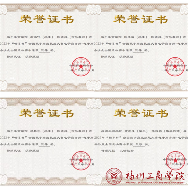 为保障比赛顺利进行,师生们群策群力,提前规划好各项预案,并以积极专业的态度解决竞赛相关疑问。经过激烈角逐,我校电子商务专业陈娥祥老师指导的黄志峰、林振宇、陈尧斌、石鸿伟等四名同学在全国总决赛中获得三等奖。本次比赛成绩的取得,进一步推动我校电子商务人才培养转型升级,我校将以此为契机,加强专业建设,探索技能人才培养新模式,不断提升人才培养质量。同时,学校将继续紧跟电商新业态和行业风向标,培养出更多电商专业素质技能人才,不断提升学生的数字技术技能。