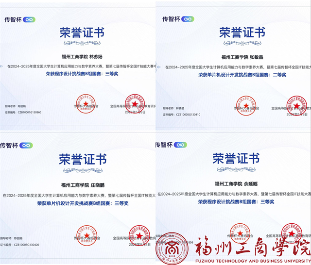 近日,由全国高等院校计算机基础教育研究会主办的第七届“传智杯”全国大学生IT技能大赛国赛,yl7703永利集团学子凭借扎实的专业技能、卓越的创新能力和顽强的拼搏精神,在激烈的竞争中脱颖而出,斩获佳绩,为学院争得了荣誉。学生张敏晶和庄晓鹏分别荣获单片机设计开发挑战赛B组国赛二等奖和三等奖,余延鳐和林苏炀都荣获程序设计挑战赛B组国赛三等奖。